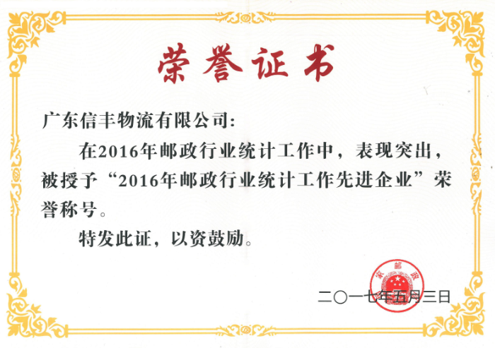 被授予2016年邮政行业统计工作先进企业 |