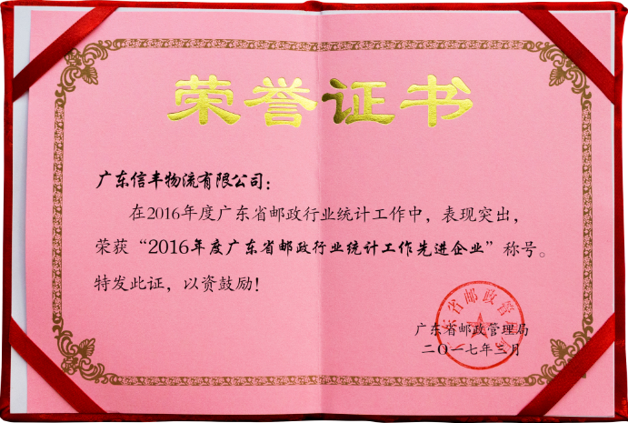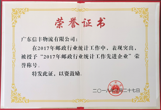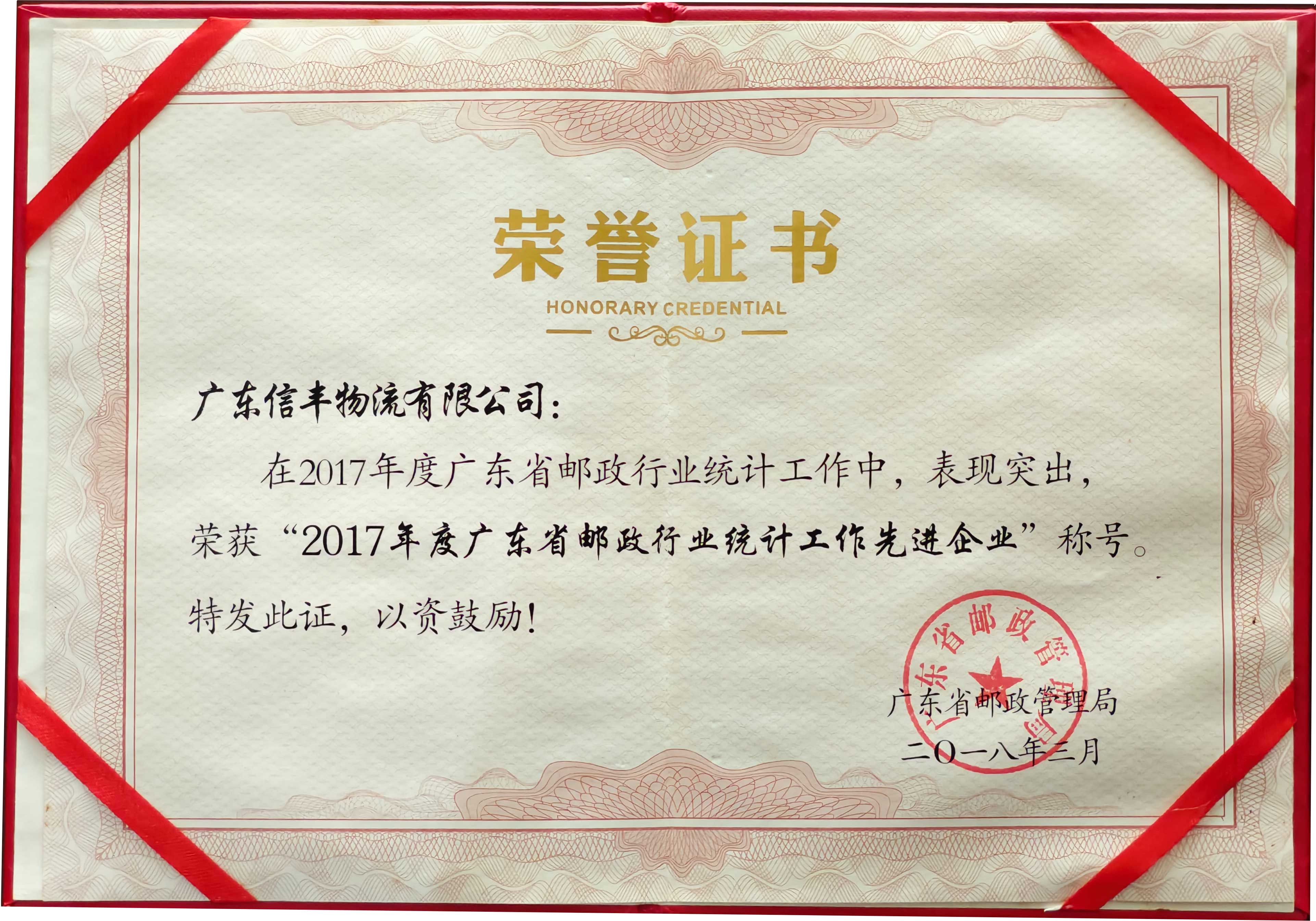 被授予“2017年度广东省邮政行业统计工作先进企业” |