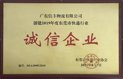 被授予“创建2019年度东莞市快递行业诚信企业” |