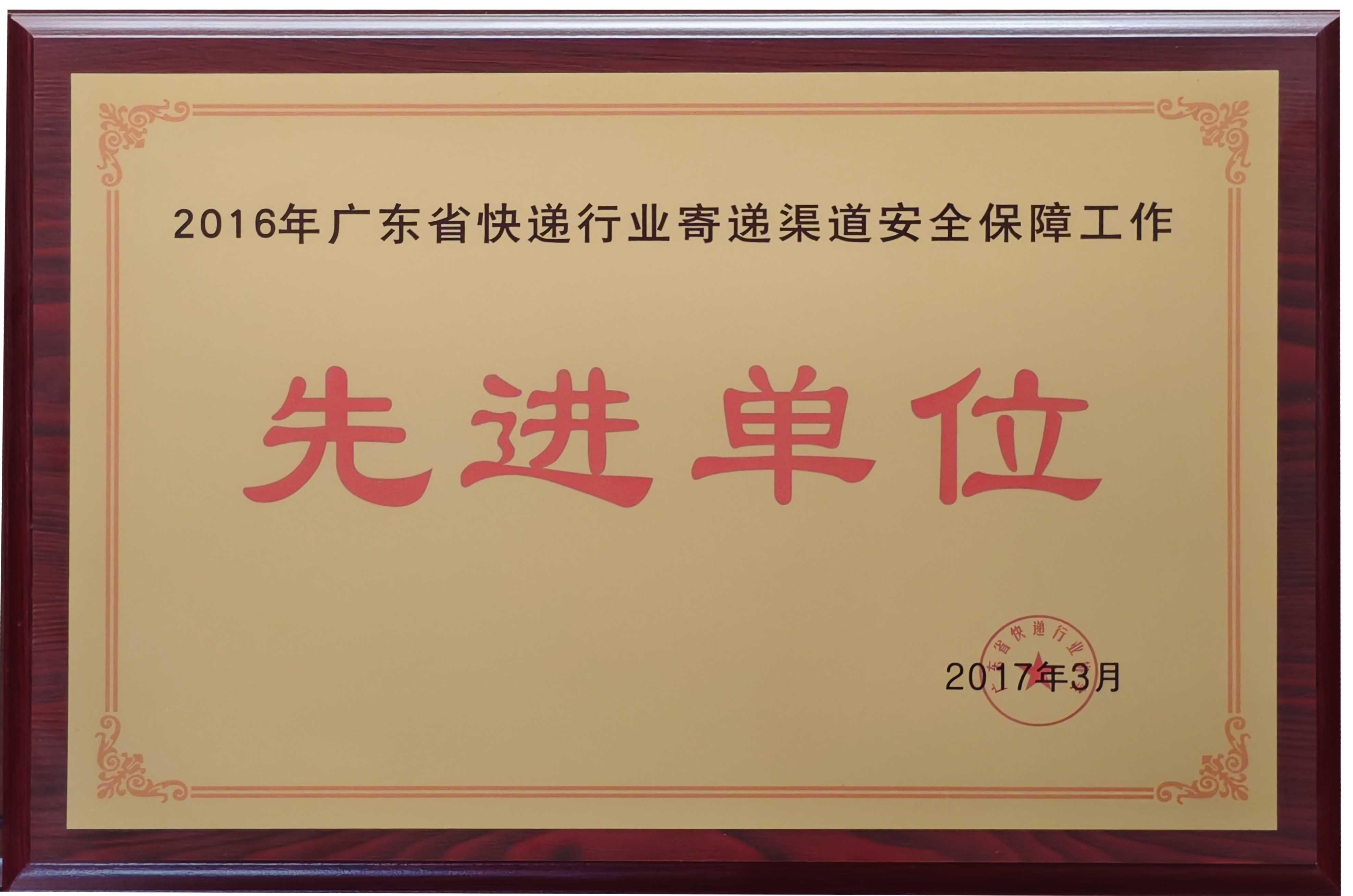 被授予“2016年广东省快递行业寄递渠道安全保障工作先进单位” |