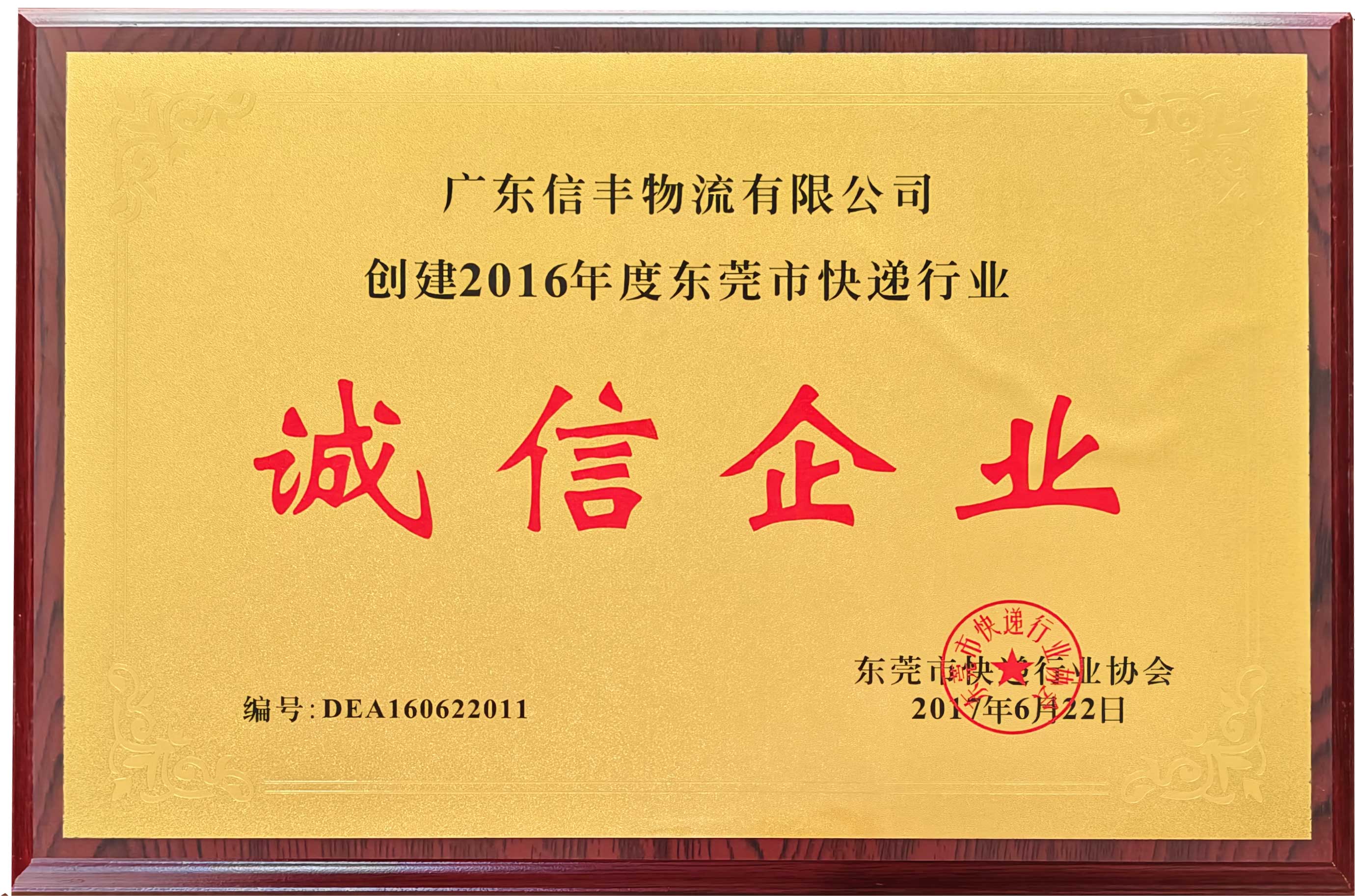 被授予“创建2016年度东莞市快递行业诚信企业” |