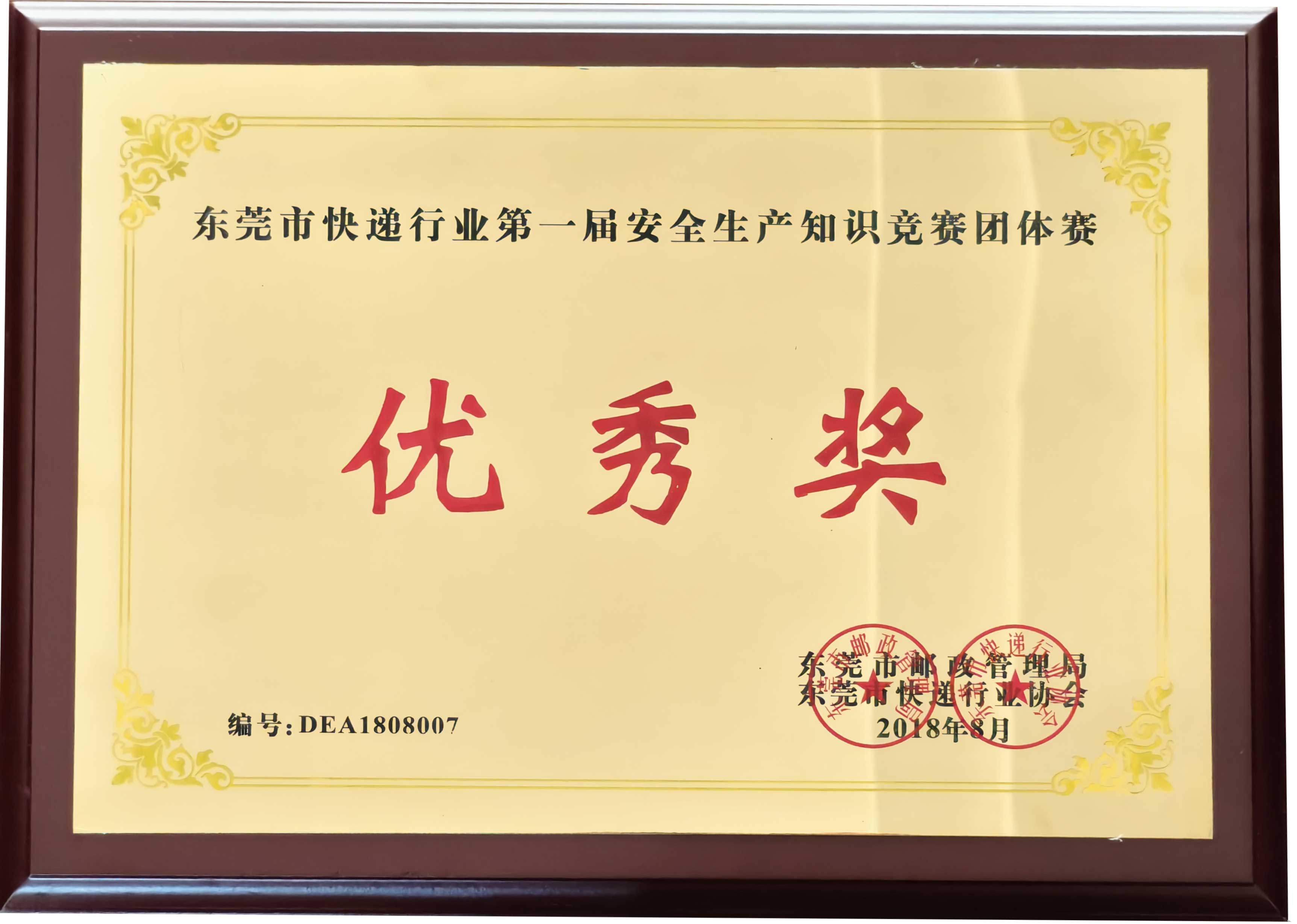 被授予“2018年度东莞市快递行业第一届安全生产知识竞赛团体赛优秀奖” |