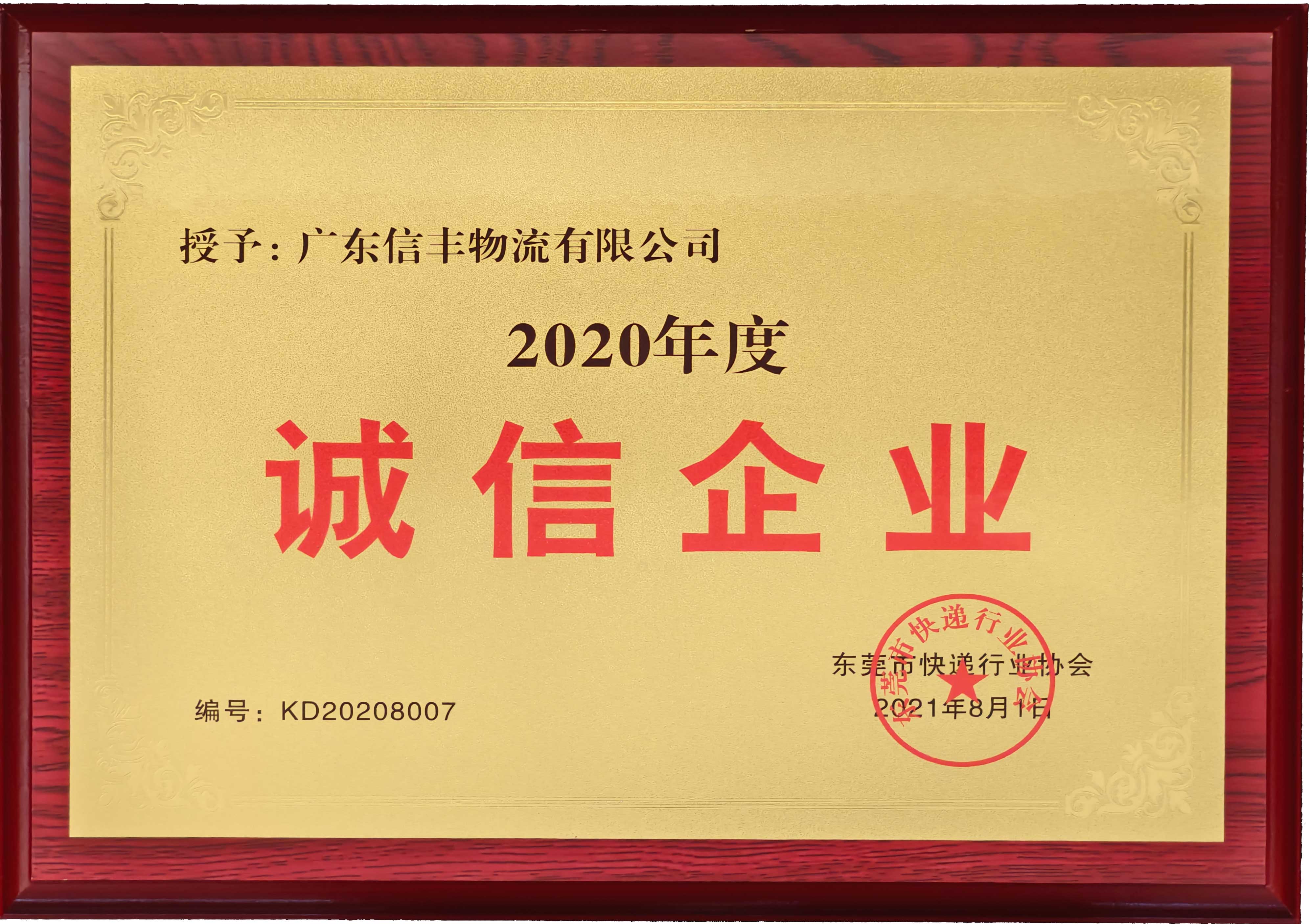 被授予“2020年度东莞市快递行业诚信企业” |