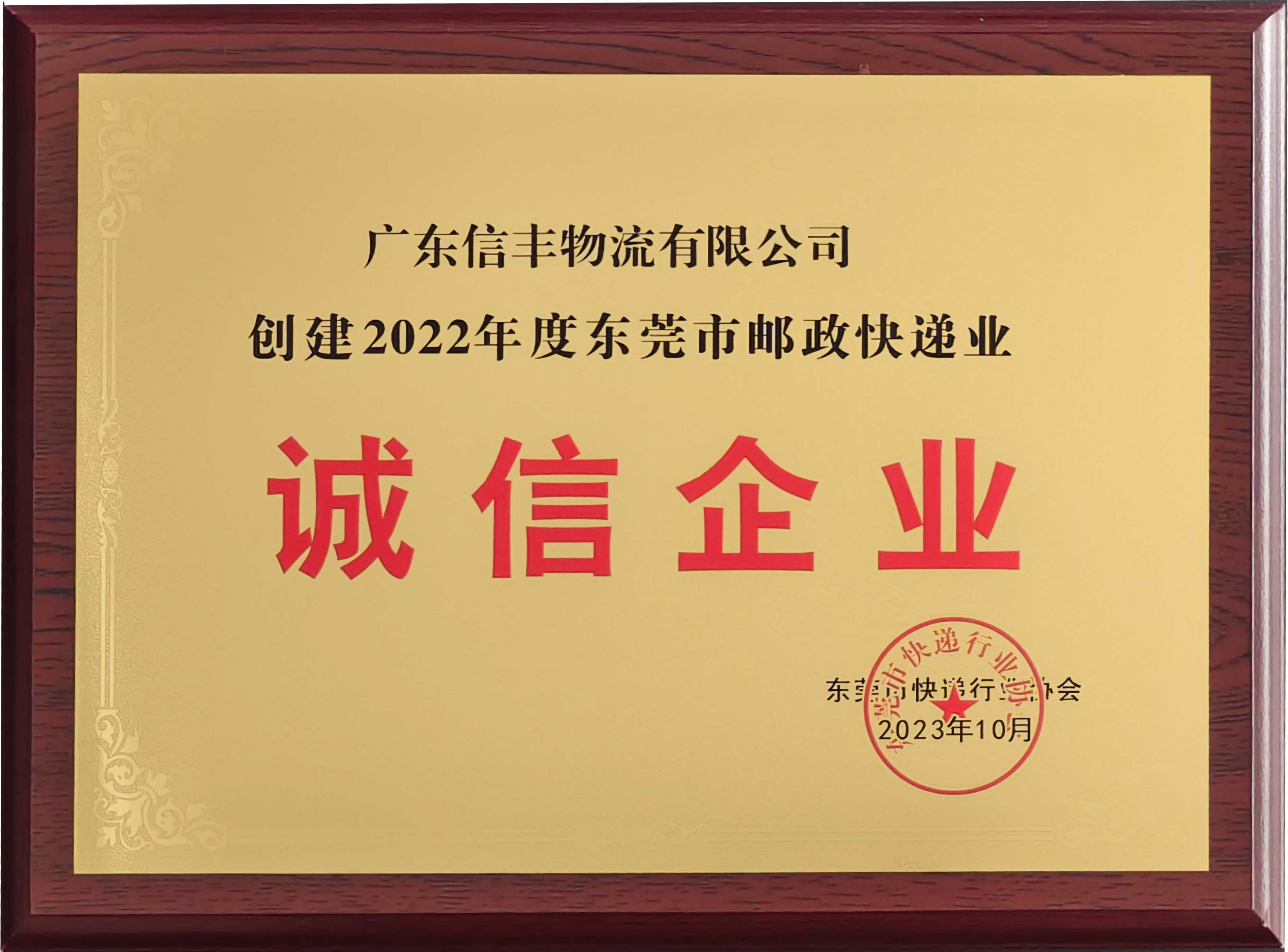 被授予“创建2022年度东莞市邮政快递业诚信企业” |