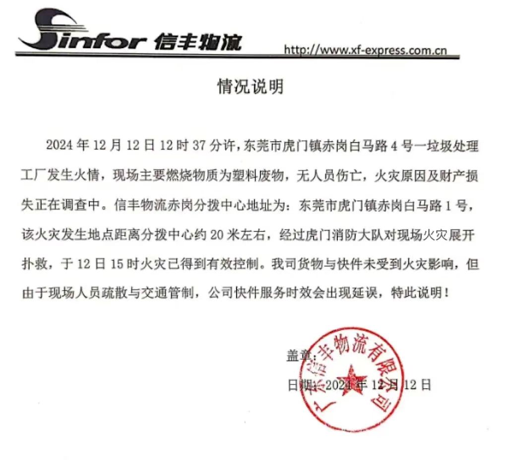 您好,2024年12月12日12时37分许,距离赤岗分拨中心约20米左右的一垃圾处理工厂发生火情,目前火灾已得到有效控制,我司中转环节均已恢复正常。