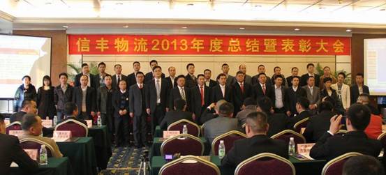 信丰物流 2013 年年度总结暨表彰大会于2014年1月19日下午 2 :30 分,在虎门龙泉国际大酒店四楼多功能会议厅隆重召开。公司董事长兼总裁徐俊斌、副董事长张泽林、董事袁锡沛、拓展部副总经理沈茂军、直营事业部总经理彭修奎、营运部副总经理吕国彬、分拨中心总监杨子全、北京信丰项目部、福建信丰、泉州信丰等外省公司负责人以及总部各部门负责人,各分公司负责人共 400 余人出席大会。