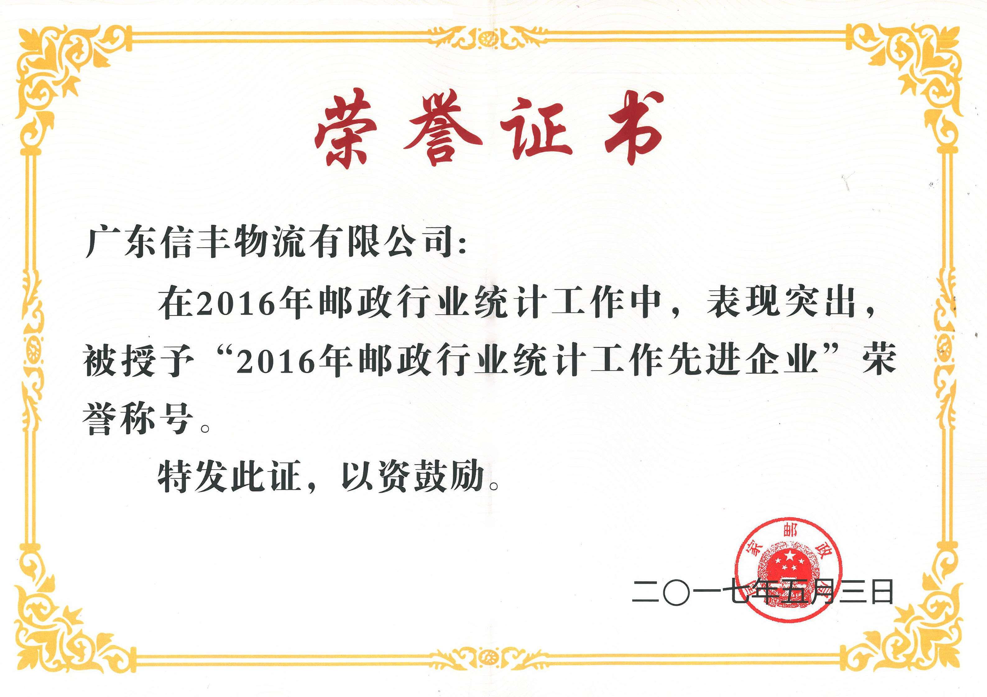 热烈祝贺广东信丰物流有限公司荣获“2016年邮政行业统计先进工作企业”的荣誉称号
