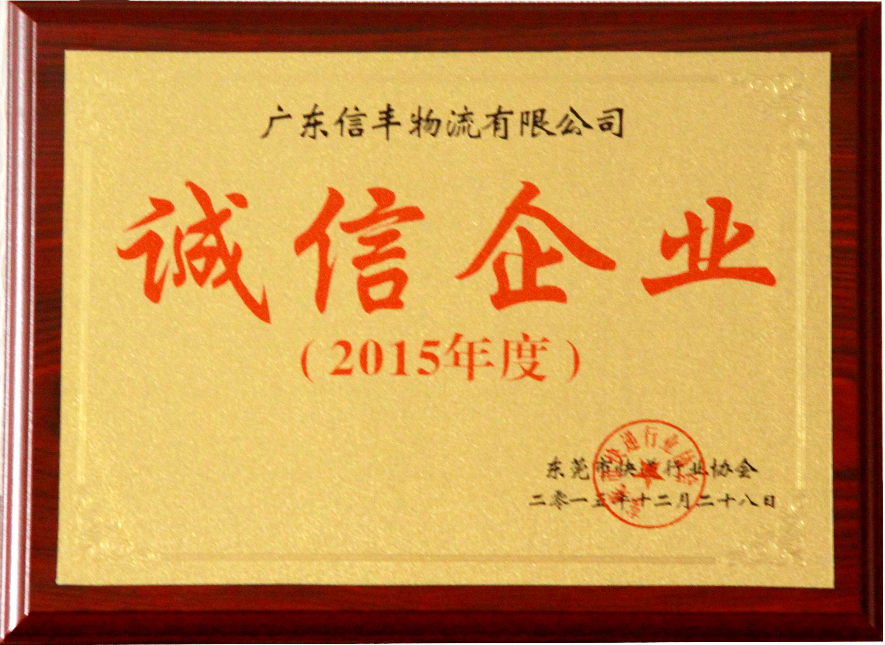 东莞市快递行业协会举办的2015年快递企业信用评价工作结果揭晓,广东信丰物流有限公司以其突出的综合实力和良好的社会口碑,得到了同行业的认可,也得到了消费者的首肯,在东莞地区塑造了良好的企业形象,被光荣授予“诚信企业”荣誉称号。
