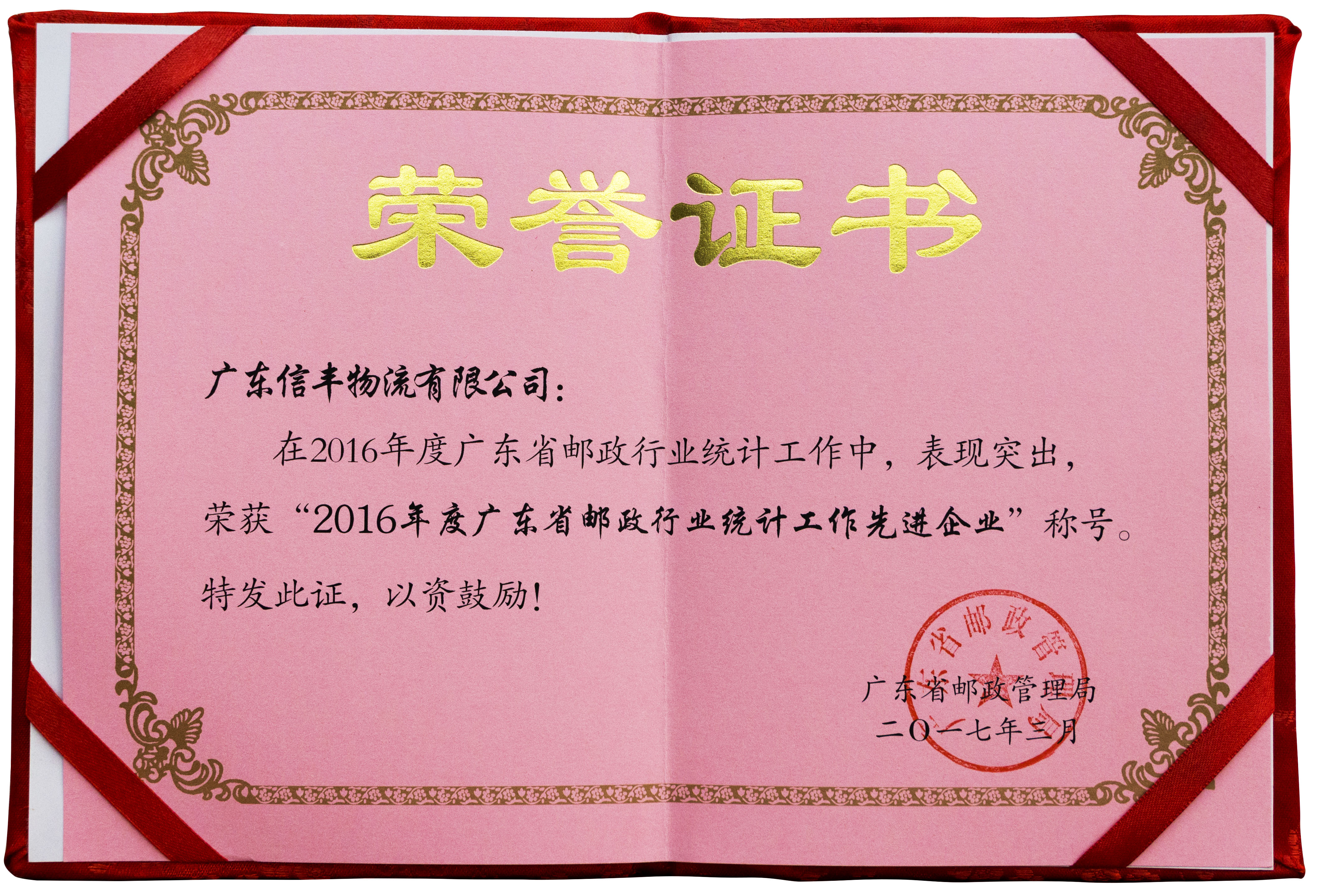 喜讯:2017年04月28日,广东信丰物流有限公司荣获“2016年度广东省邮政行业统计先进工作企业”荣誉称号,可喜可贺!
