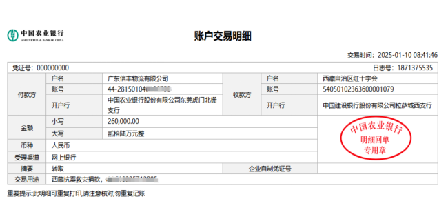 信丰全网心系灾区人民,秉持着“一方有难,八方支援”的信念迅速响应,从总部到全网各分公司共同积极组织开展了一场西藏日喀则地震爱心募捐活动。自2025年1月8日14:30开始截至2025年1月9日18时,信丰物流全网共募集爱心善款共计26万元并于1月10日上午向西藏自治区红十字会官方指定通道进行捐赠,用于日喀则地震灾区的紧急救援、灾后恢复重建等工作。